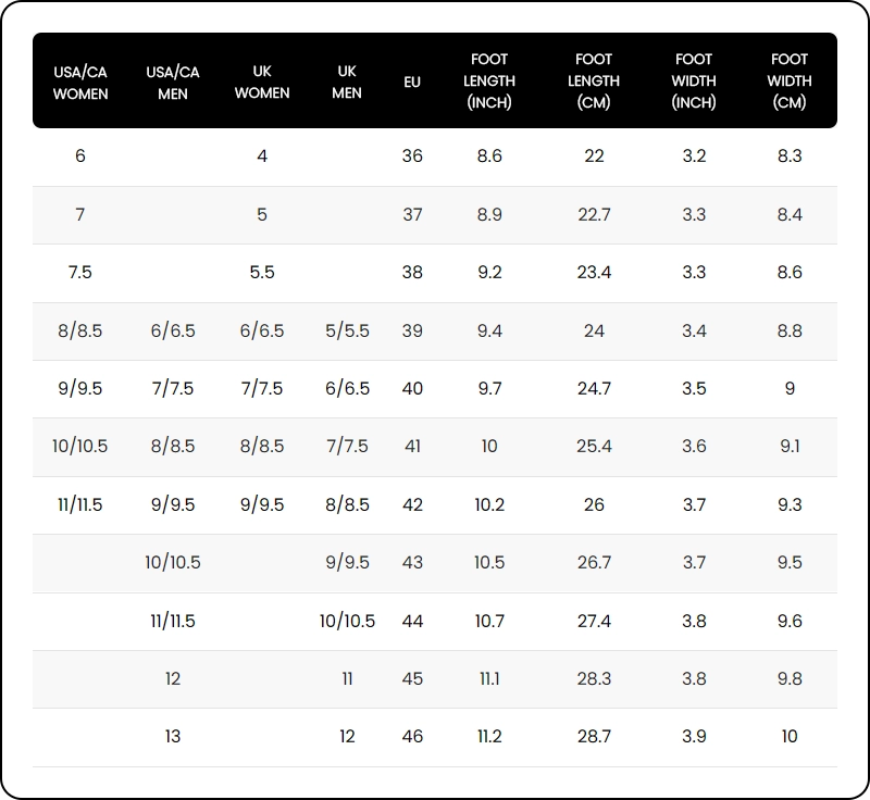 USA/CA Women USA/CA Men UK Women UK Men EU Foot Length (inch) Foot Length (cm) Foot Width (inch) Foot Width (cm)
