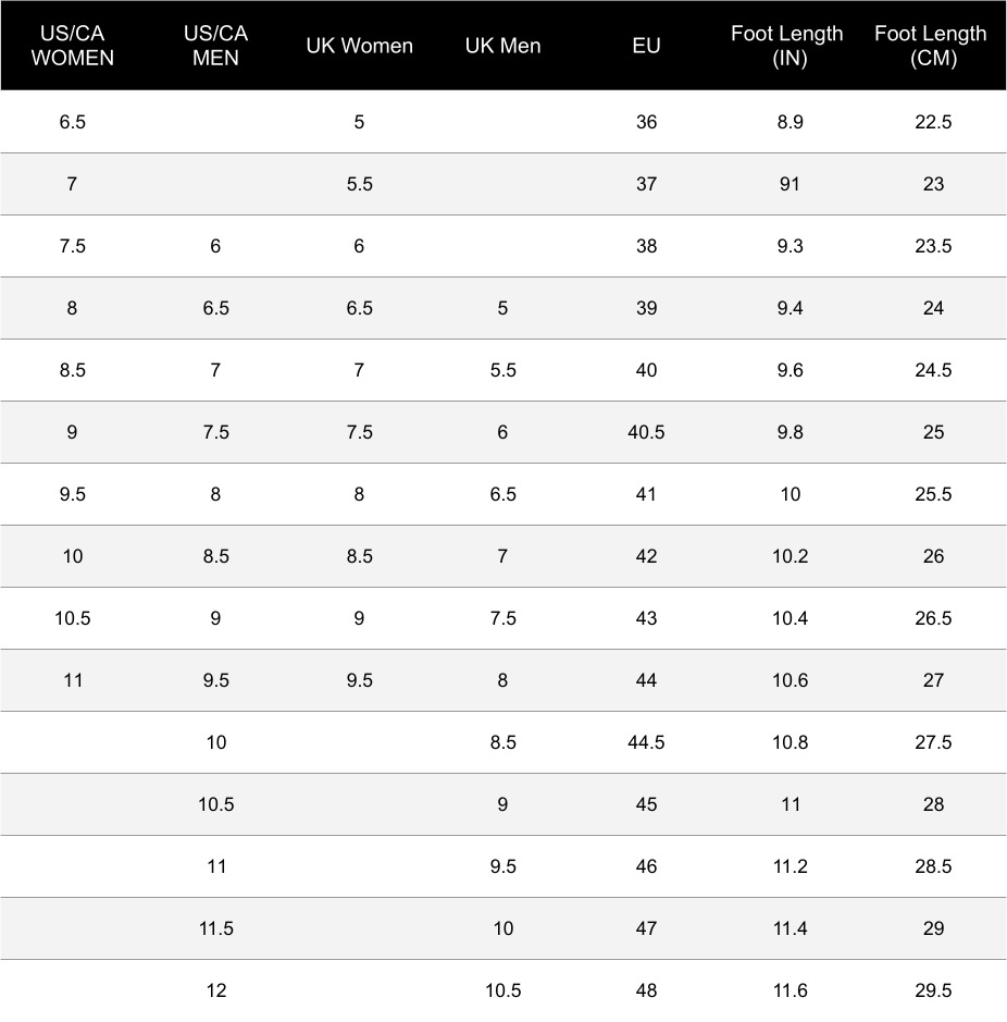 | USA/CA Women | USA/CA Men | UK Women | UK Men | EU | Foot Length (inch) | Foot Length (cm) |