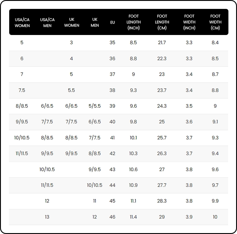 | USA/CA Women | USA/CA Men | UK Women | UK Men | EU | Foot Length (inch) | Foot Length (cm) | Foot Width (inch) | Foot Width (cm) |