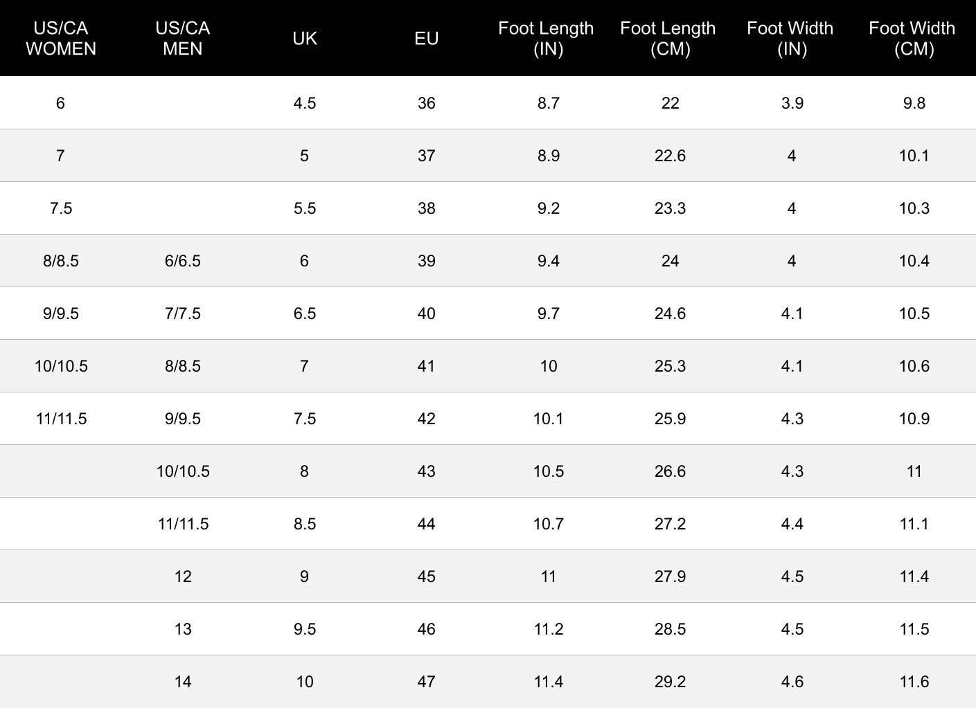 | USA/CA Women | USA/CA Men | UK Women | UK Men | EU | Foot Length (inch) | Foot Length (cm) | Foot Width (inch) | Foot Width (cm) |